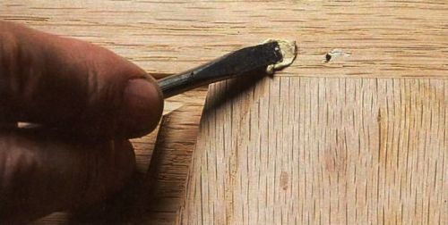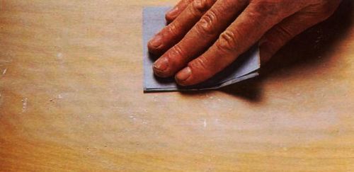 Подготовка поверхности под отделку. В эту операцию входит заделка трещин, вмятин, выпавших сучков и прочих дефектов поверхности, которые образовались в результате предыдущей механической обработки. Крупные, глубокие трещины, щели и пустоты заделывают деревянными вставками на клею, мелкие - шпатлевкой. Вмятины можно устранить как шпатлеванием, так и обильным смачиванием замятой древесины: впитав влагу в себя, она набухнет, и вмятина выровняется. Выровняв подготавливаемую поверхность, ее строгают двойным рубанком, с тем чтобы сделать максимально гладкой. По завершении этой процедуры оструганную поверхность протирают влажным тампоном и после высыхания шлифуют мелкозернистой шлифовальной шкуркой либо пемзой, чтобы устранить мельчайшие ворсинки, делающие поверхность шероховатой. Эту операцию повторяют несколько раз. Если обрабатываемое дерево твердой породы, то ворсинки убирают циклеванием (для мягких пород цикля не годится, так как она не срезает, а лишь приминает ворс на них). Циклю водят вдоль волокон. Места угловых соединений циклюют вдоль шва под острым углом к направлению волокон. Цикля используется также для удаления с поверхности изделий - мебели, дверей, паркета и т.д. - лака и старой краски перед их покраской. Для облегчения процесса старую краску можно размягчить, разогревая ее утюгом через фольгу; того же можно добиться, протирая поверхность смесью ацетона и бензина (1:1).