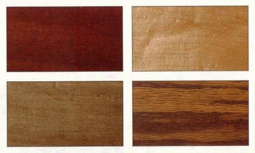 На древесине разных пород - красное дерево (вверху слева), клен (вверху справа), тополь (внизу слева) и дуб (внизу справа) - одна и та же морилка выглядит по-разному, На красном дереве морилка выглядит очень красной. На клене ее почти