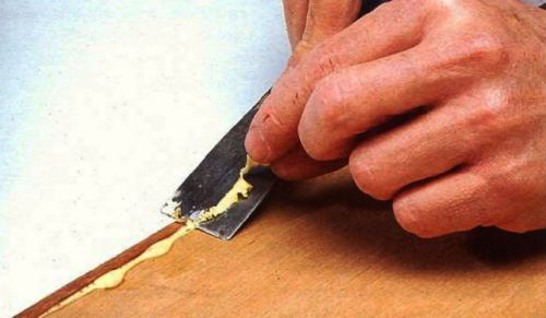 Есть два способа удалить клей: немедленно стереть его влажной тряпкой или же позволить ему застыть до такой степени, чтобы вы смогли поддеть его полоску шпателем или тупой стамеской. В обоих случаях вам придется обработать эти места наждачной бумагой, чтобы удалить любые остатки клея, впитавшиеся в древесину. Если клей затвердеет, до того как вы успели его удалить, вам придется его соскребать. Так можно повредить древесину. Поэтому лучше всего удалить клей еще до того, как он успел затвердеть.